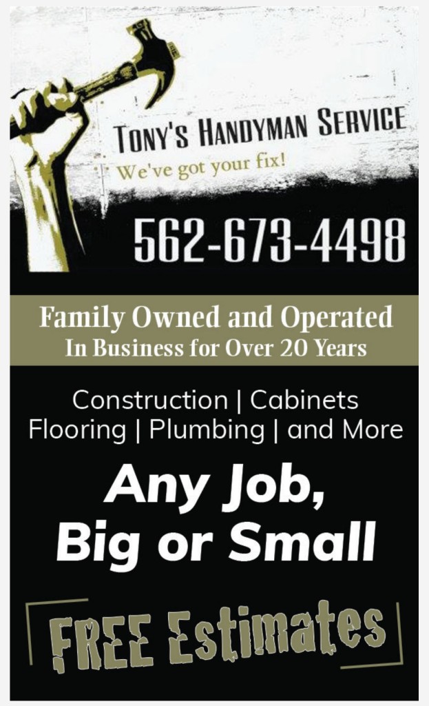 Call Tony for all your home needs! He’s amazing and can do it all! Call 562-673-4498 or head to his Facebook Page